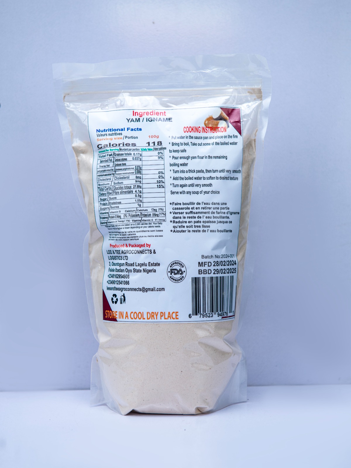 Lee & Tee Yam Flour is derived from premium grade, 100% ‘male’ yam tubers harvested from Nigeria. It is a versatile and easy to prepare meal, noted for its rich energy. After preparation, just eat with soups and other vegetables, as desired. Yam Flour is a great vegetable to include in diets. It is linked to various health benefits and may boost brain health, reduce inflammation, and improve blood sugar control. As producers our objective is that the meal derived from this flour should be nutritious, nourishing and tasty. Our brand is 100% natural and FDA certified.
